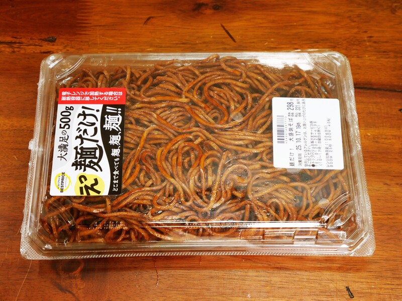 その名も「麺だけ大盛り焼きそば」で、内容量は500グラムのデカ盛りサイズ。価格は税別298円という激安っぷり。パッケージには「どこまで食べても麺、麺、麺!」と書かれていて、確かにその通り、ビジュアルからして完全に麺である。