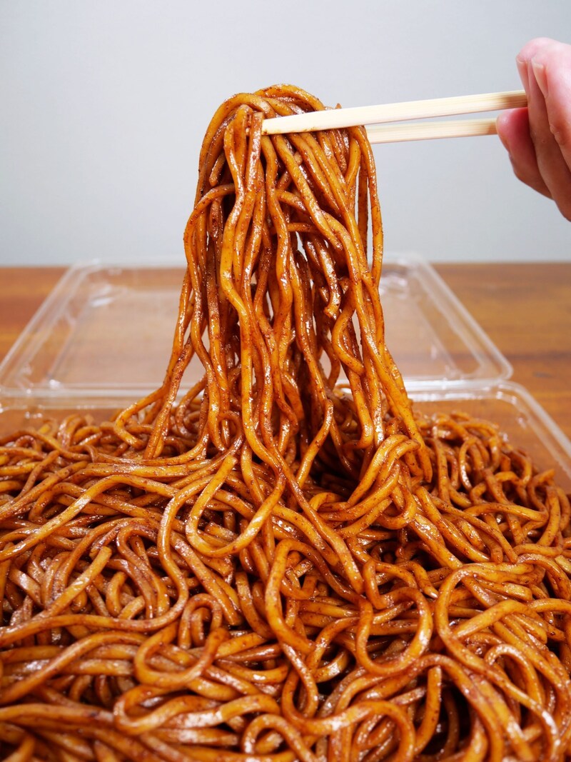 食べる。濃い! ソースがガッツリときいていて、濃い! 凄まじく焼きそば感を楽しめる、余計なものがいっさいないピュア焼きそばテイスト! ややソースの味が濃いめなので、この焼きそばをおかずにして、ライスやお好み焼きやたこ焼きを食べてもいいかもしれない。