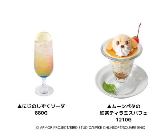 「にじのしずくソーダ」、かわいい犬の姿を模した「ムーンペタの紅茶ティラミスパフェ」