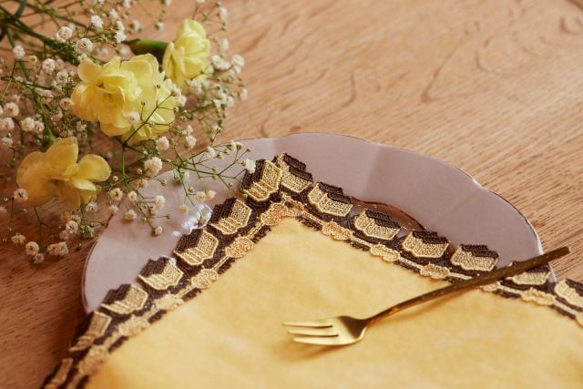 長崎県で創業し、2024年に400周年を迎えた福砂屋。2024年に制作した記念の「近沢レース店」とのコラボハンカチを、今年も新たな色を追加して数量限定で販売。福砂屋オリジナルのレースには、お皿にのったカステラと「カステラ」の文字、さらに福砂屋の商標として親しまれている蝙蝠(こうもり)が織り込まれています。