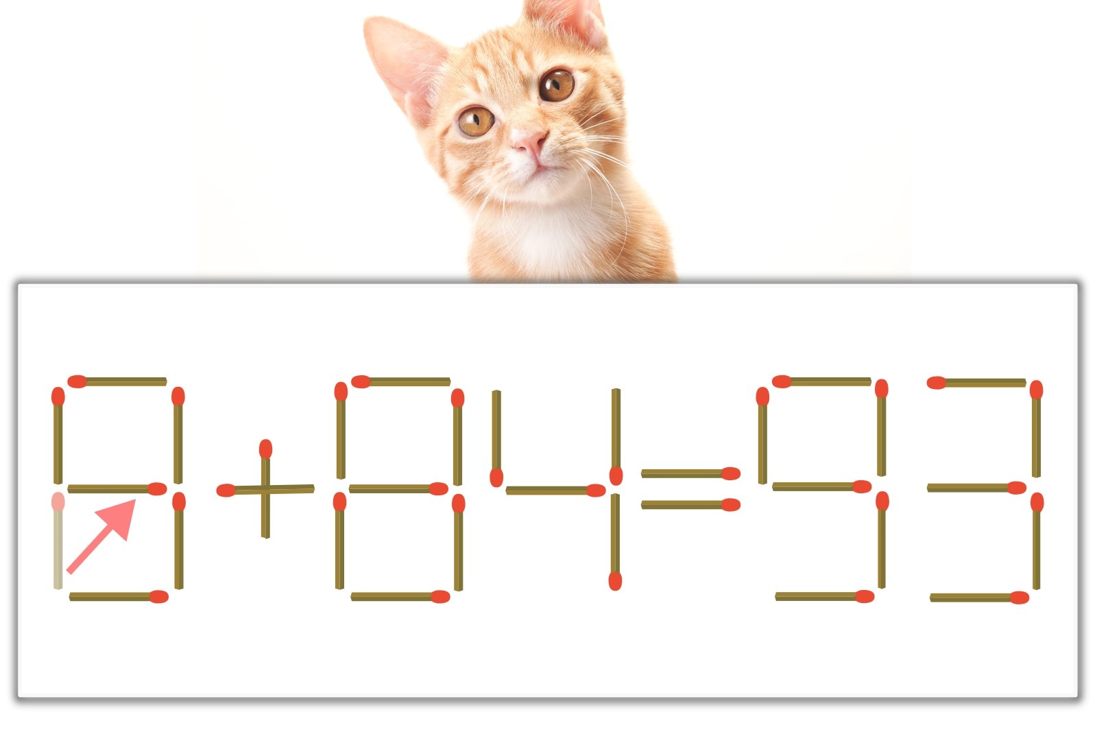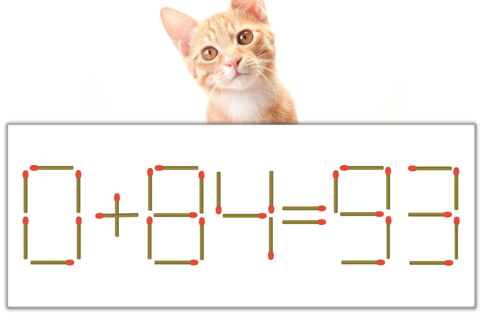 問題の「0」を別の数字に変化させると答えが導き出せます。0のマッチ棒を1本移動させて、「9」にしてみましょう。すると、「9+84=93」が成立します。