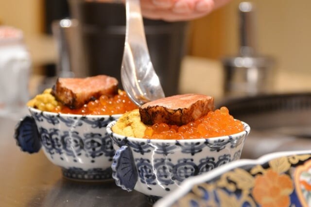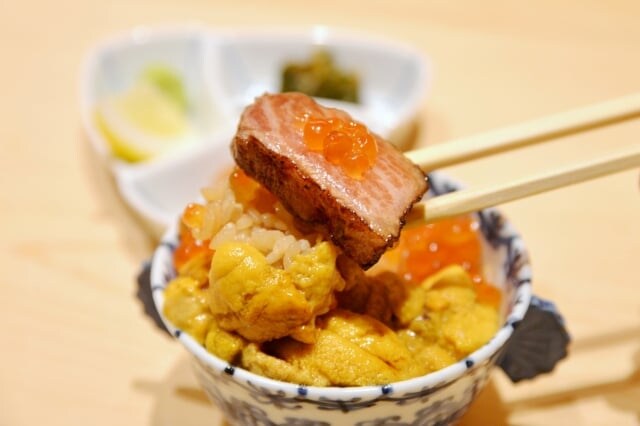 そしてコースは、トップバッターからフルスイング。単品でも5500円(小)する、コース内でも目玉の『至福の三色丼』が登場し、一気に心をつかんでくれます。ちなみにこの“三色”はウニ、イクラ、本マグロの大トロの構成ですが、極めつけはやはり大トロ。惜しげもなく“焼うお”の真骨頂で楽しませてくれるところも、まさに粋!