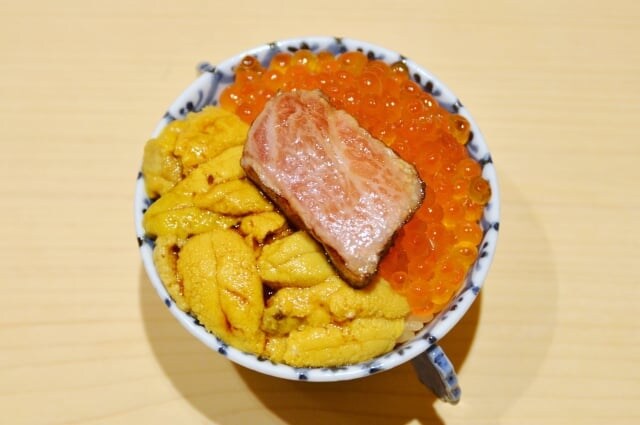 今回味わったのは、名物の『三色丼コース』。ひとり1万8000円(昼は若干内容が変わり1万5000円)と、なかなか高嶺の花ですが、ここは日本で最も地価が高いともいわれる銀座四丁目。それに銀座で鮨、もしくは高級焼肉ですから会食としては相応、むしろ安いといえるかもしれません。