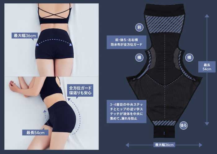 吸収体は全長約54cm、最大幅36cmのロング&ワイド仕様で、前後・横からの漏れを全方位ガードします。