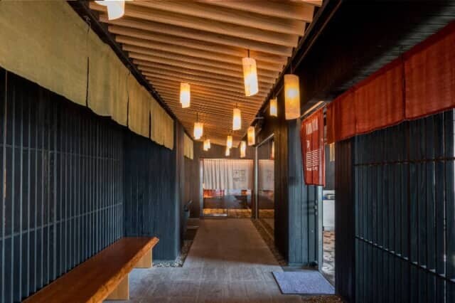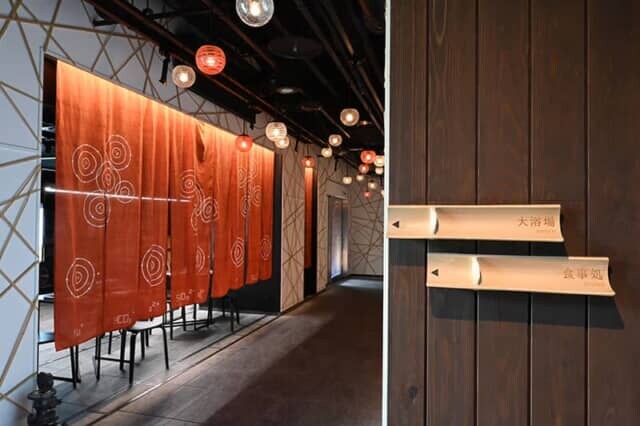 湯の広場やレセプション、ショップ、大浴場などをつなぐ廊下を歩くと、格子などで仕切られたり、それぞれ暖簾がかかっていたりと、お店が軒を連ねたような造りになっていて、別府の温泉街にある路地のよう。廊下ごとに壁の素材や照明のデザインを変え、それぞれちがう通りを歩いている気分です。