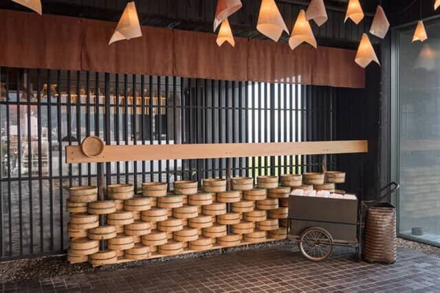 大分県は日本一のマダケの産地で、伝統工芸品の “別府竹細工” が有名です。館内には竹を使った案内板や壁の装飾も見られます。アクティビティなどが行われる「ラボ」には大きな暖簾がかかり、壁の模様は竹を不規則に編む “やたら編み” をイメージしています。