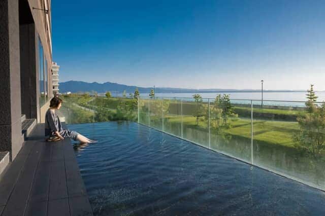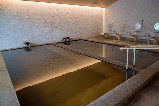 大浴場は2階廊下の奥にありますが、植物の植えられたオープンテラスの庭園を抜けていくため、外湯のお風呂を使いに行く気分。泉質はナトリウムー塩化物・炭酸水素塩温泉で、重曹成分を含むため、角質を軟化させ肌を滑らかに整えます。また海に面した温泉は塩分を多く含み、保温効果が持続して体がポカポカになりました。