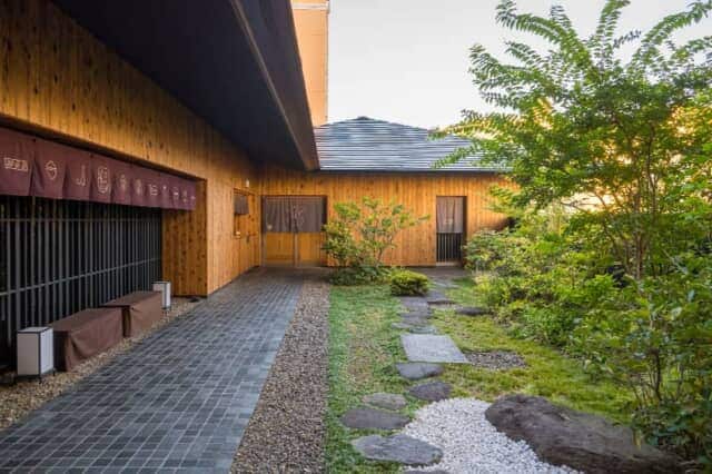 別府市の木のキンモクセイやモミジ等が植えられた庭園には、別府の川石が砂利として敷かれ、市の西にある鶴見岳の噴火でできた “別府石” も飾られます。テラスの一角には椅子が置かれ、湯上がりは夕涼みをしながらゆず蜜や麦茶、アイスキャンディーを楽しめます。
