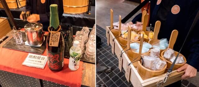 スタッフが木製の片手桶に入れて配って回るのは、葛(くず)で作られた溶けないアイスキャンディーの「葛アイスバー」。モチっとした食感で、ラムネやみかんなど4種類の味をそろえます。焼酎屋台も登場し、焼酎やドリンクも振舞われます。地獄めぐりが人気観光コースの土地柄に合わせ、大分の麦焼酎「常圧閻魔」を用意していました。