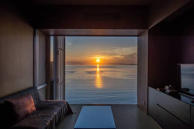 真東に向いた客室からは、別府湾に昇る美しい日の出を見られます。旅館のスタッフが、日の出の時刻を教えてくれるので、目覚ましをセット。穏やかな海を金色に照らすサンロードも見事。素敵な想い出がまたひとつ増えました。