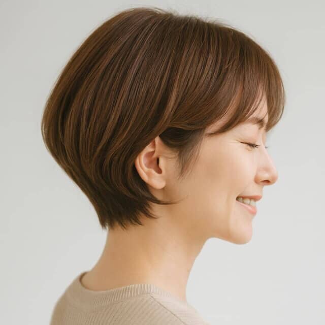 フェミニンさを残したい人には、ふんわりとした“丸みショートボブ”がおすすめ。後頭部にボリュームを出し、毛先を内巻きに整えるだけで、首がほっそり見えて若見え効果を期待できます。