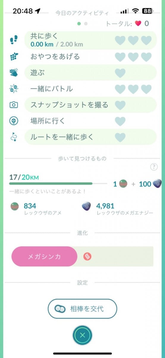 ▲20km(ポフィン使用で10km)で、メガエナジーx100を入手可能。メガシンカレベルが高まってくれば簡単に維持が可能になるので、最初のうちはメガシンカを頻繁に行うのが良いかも。