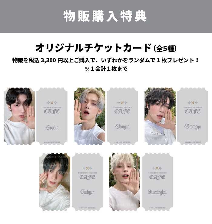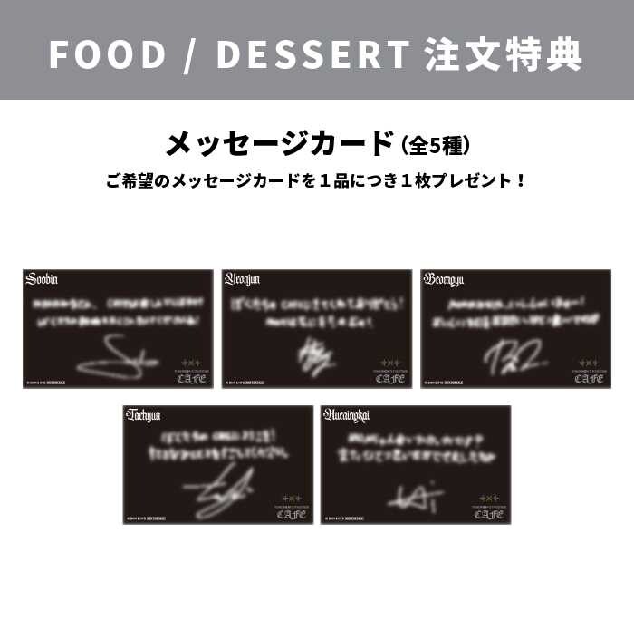 また、FOOD/DESSERT注文で「メンバー別メッセージカード(全5種)」、DRINK注文で「オリジナルコースター(全5種)」、物販で税込3,300円以上購入で「オリジナルチケットカード」が各特典条件に応じてプレゼントされます(※1会計につき1枚まで)。