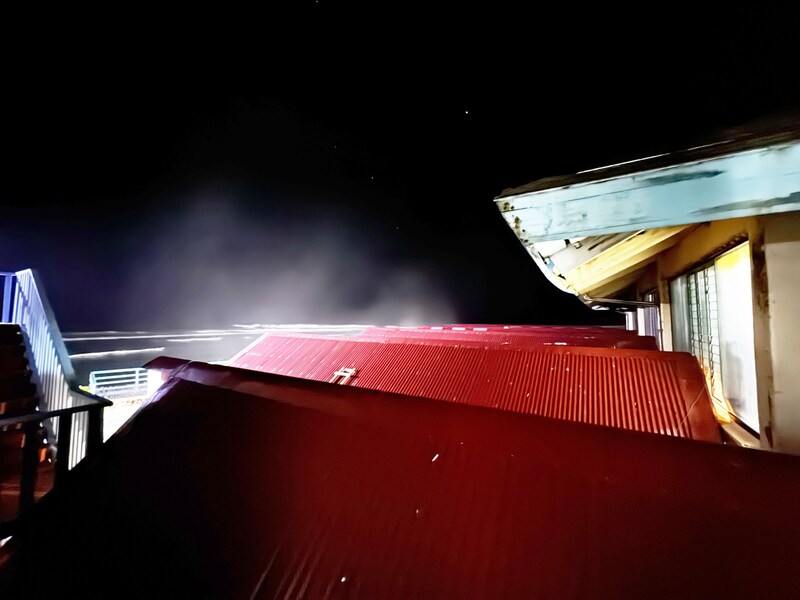 部屋にはベランダがあって、椅子がふたつ用意されていました。景観は、目の前が屋根。しかし、遠くに海が、少しだけ見えました。ほんのわずかですが。景観に関しては、シービューの部屋が満室で予約できなかったので、仕方ないですね。