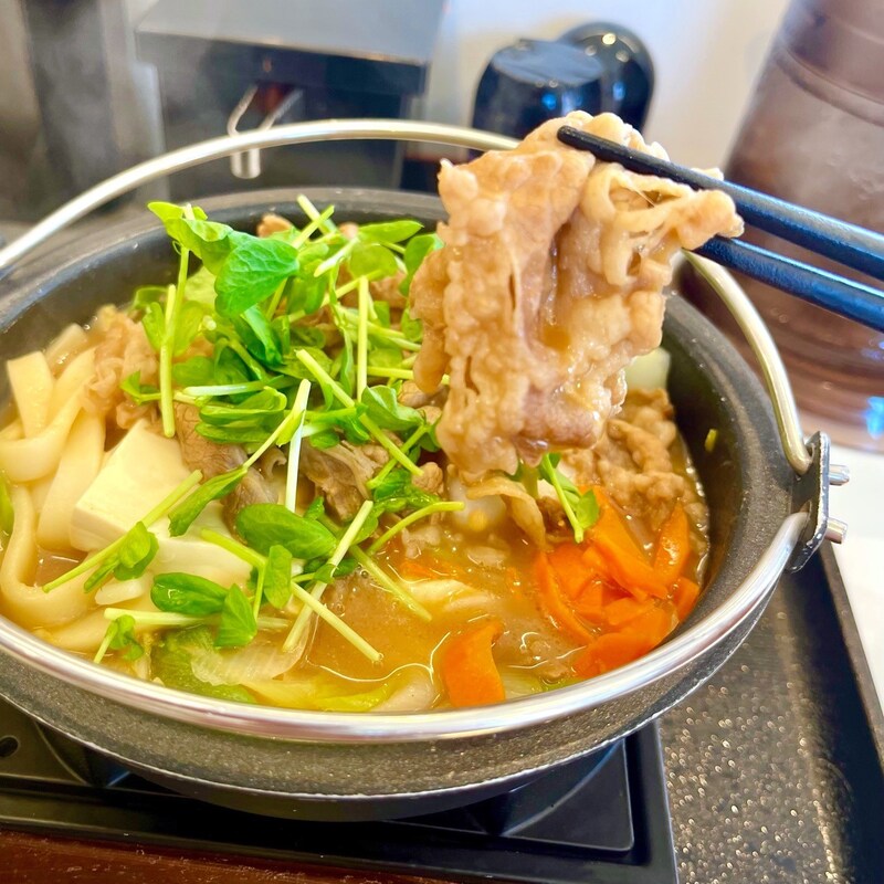 具は「牛すき鍋膳」と同じく、大ぶりな牛肉に白菜、ねぎ、豆苗、人参、絹豆腐、きしめんというラインナップ。牛肉は非常に柔らかく、とんこつや鶏ガラの出汁もしっかりと染みていて、動物系の力強い旨みが感じられる。