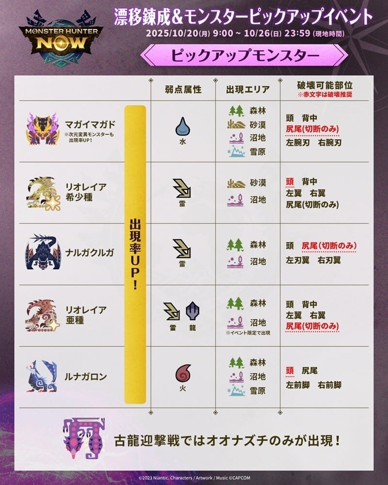 次元変異を含め明日からも継続して出現するほか、ガンナー向けのスキルが豊富なルナガロンやいま話題の回避装填があるナルガクルガ。