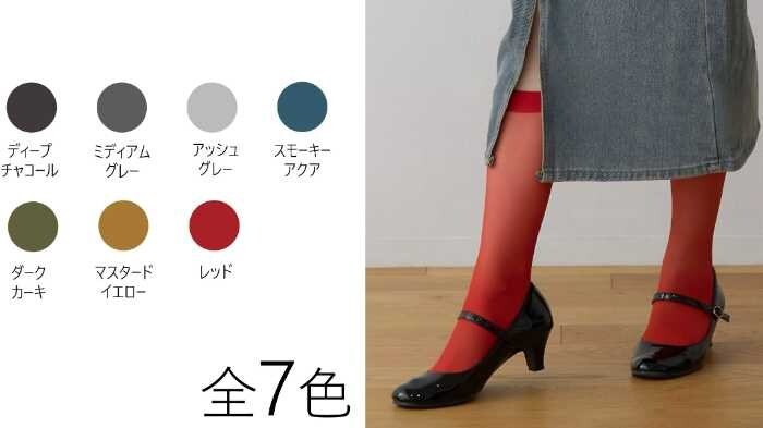 たとえば、25デニールカラーシアータイツ(880円)なら、肌に馴染みつつカラーが引き立つ絶妙な透け感が特徴で、カジュアルからフェミニンまで幅広いスタイルに対応します。
