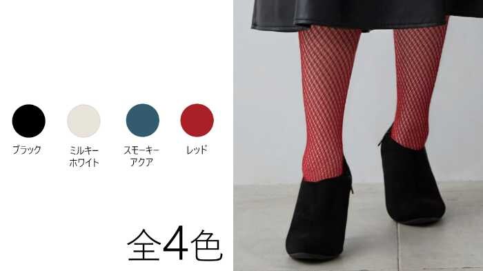「Atsugi COLORS」のタイツやソックスは、シンプルにカラーを楽しむだけでなく、レース柄やダブルフィッシュネット柄のようなユニークなデザインで脚元を華やかに彩ります。