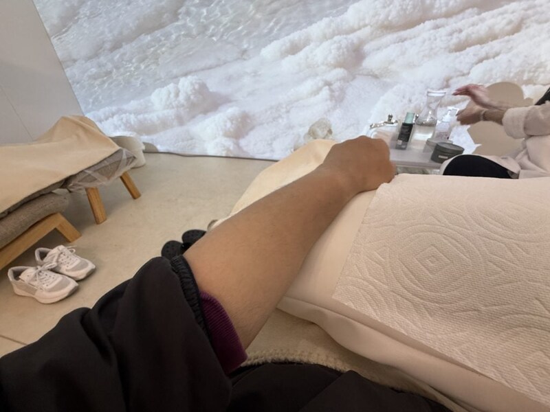 死海の映像を見ながら泥パックをしてもらってのハンドマッサージ、なんともリラックスできるひとときであった。
