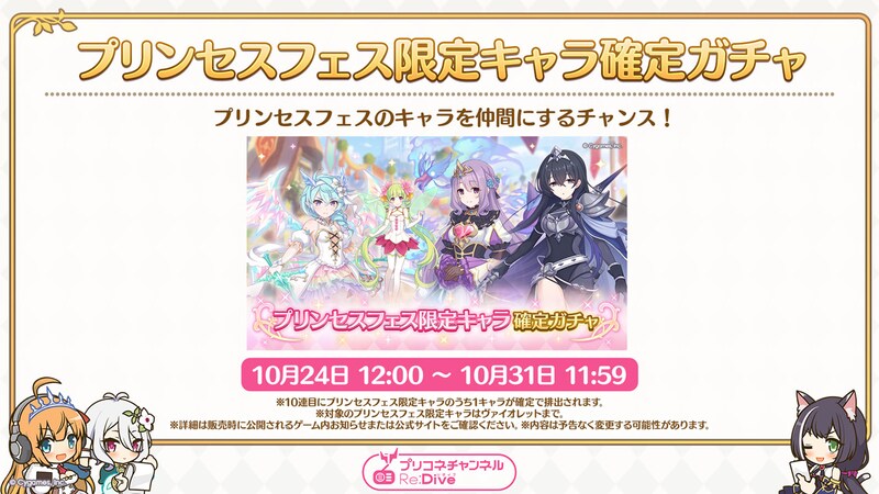 ゾンビランドサガコラボを記念して、「プリンセスフェス限定キャラ確定ガチャ」が 10 月 24 日(金)から開催予定です。こちらは 10 連目に必ずプリンセスフェス限定キャラが登場するガチャとなり、対象のプリンセスフェス限定キャラは 2025 年 4 月に登場したヴァイオレットまでとなります。