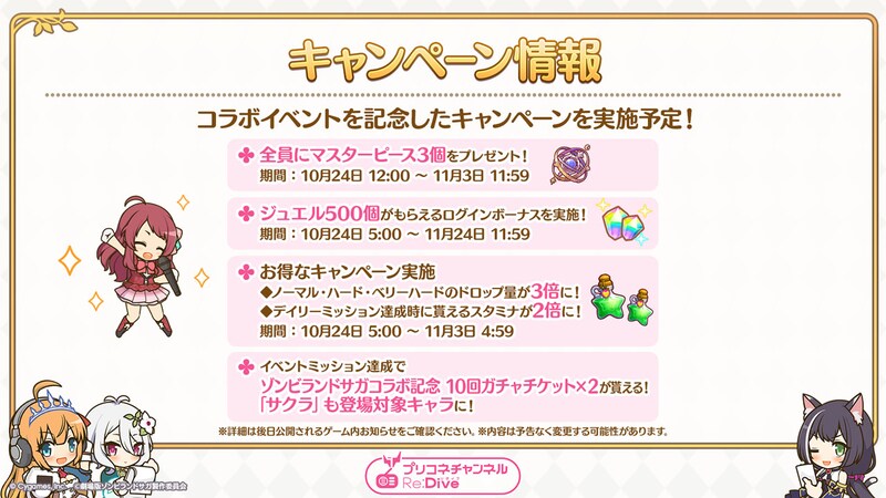 ゲームの企画・開発・運営事業を展開する株式会社 Cygames(以下、サイゲームス 本社:東京都渋谷区、代表取締役社長:渡邊耕一)は、自社で開発するアニメ RPG『プリンセスコネクト!Re:Dive(以下、プリコネ R)』について、10 月 19 日(日)に配信された「プリコネチャンネル Re:Dive」にて、10 月 24 日(金)から開催される劇場版「ゾンビランドサガ ゆめぎんがパラダイス」とのコラボ詳細情報を解禁しました。今回のコラボでは、限定キャラ「サクラ」(CV:本渡楓)が登場する他、「コラボレイドイベント」を開催します。