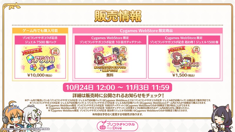 コラボ開催を記念して、コラボ開催時刻より、「Cygames WebStore 限定 ゾンビランドサガコラボ記念 超お得!1500 ジュエル」、「ゾンビランドサガコラボ記念 ジュエル 7500 個パック」の 2 商品を販売予定です。