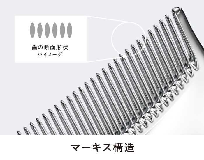 「ReFa MARQUISE COMPACT」は、空力デザインに基づいた歯の形状で髪への摩擦を軽減。中央に向かってカーブを描く流線形の歯が、やわらかなあたりで髪を整えます。
