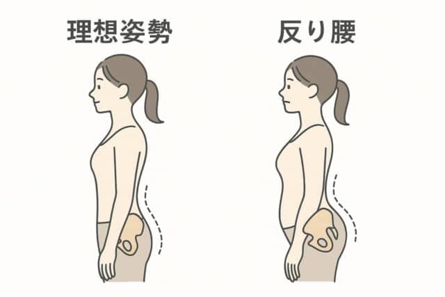 反り腰は「骨盤が前に傾いてしまう姿勢」のこと。本来、骨盤は少しだけ前傾しているのが理想ですが、座りっぱなしやハイヒールの習慣などで角度が強くなりすぎると、腰の反りが大きくなり、下腹が前に突き出たように見えてしまうのです。