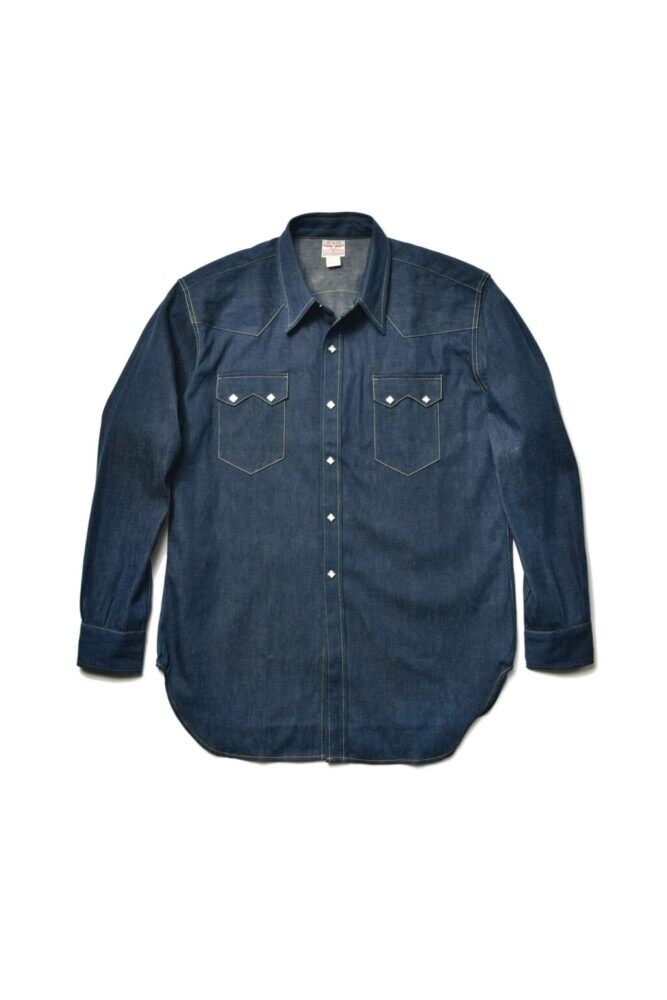 ベースは’60年代製のデニムウエスタンシャツ。アイテム名にも冠されているとおり、ノコギリの歯に似た、通称ソー・トゥースと呼ばれる胸ポケットが特徴だ。経糸のロープ染色の回数を倍以上に増やしたうえで、薄い色をレイヤリングすることによって、当時の深みある淡いブルーを忠実に再現した中白デニムを使用している。