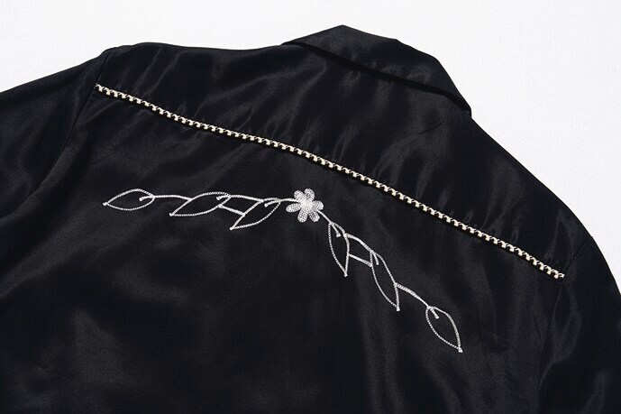 背面にも精緻な刺繍があしらわれ、ドレープの効いたヘビーなレーヨン生地にホワイトが映える。