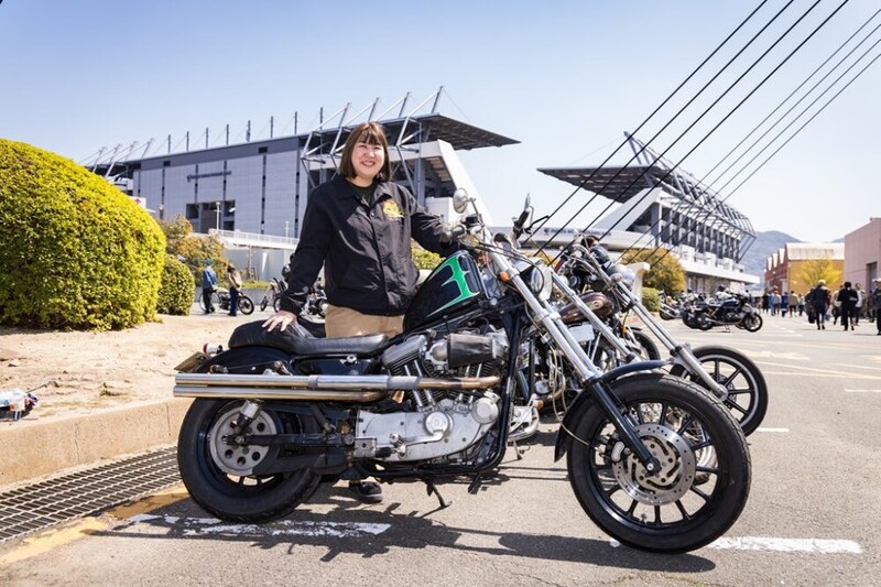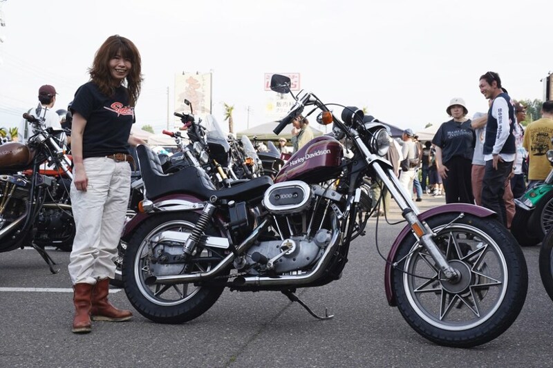 70年代のセブンスターホイール以外は、ほぼ純正パーツで組み上げたというセンスが光る一台。白のワークパンツにペコスブーツというワイルドな着こなしが、逆に女性らしさを際立たせているのだ!