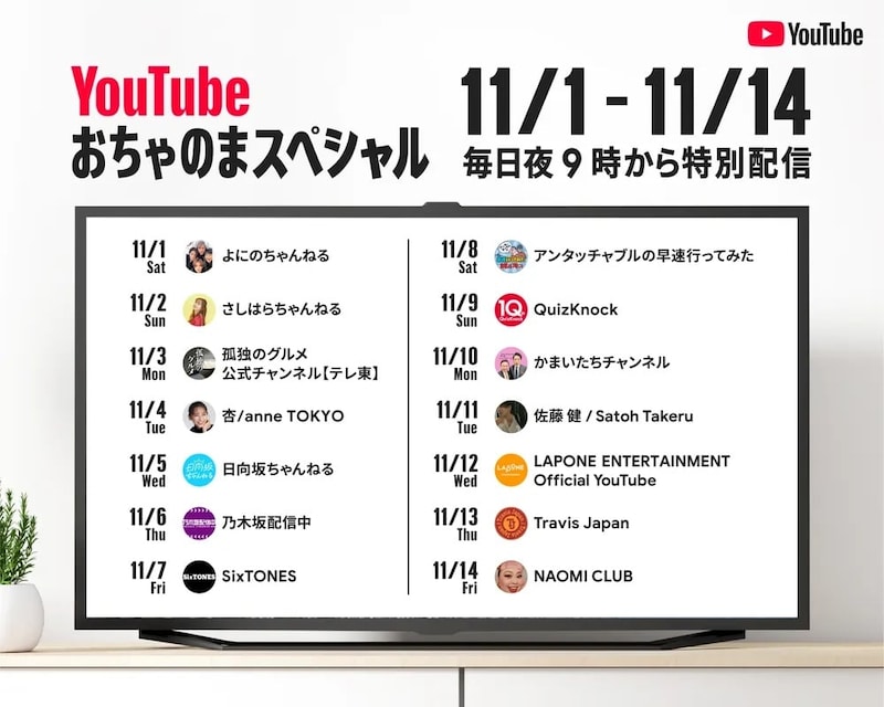 YouTubeは、テレビの大画面で楽しむ特別企画「YouTube おちゃのまスペシャル」を2025年11月1日(土)から11月14日(金)まで開催することを発表した。かつて家族がテレビの前に集まってゴールデンタイムを楽しんでいたように、YouTubeを通じて家族や友人と一緒に過ごす特別な時間を提供する企画だ。