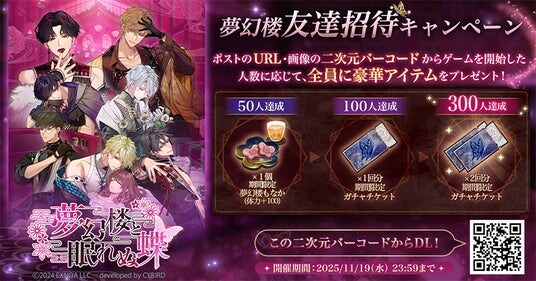 11月19日(水)に1周年を迎える「夢幻楼と眠れぬ蝶」では、様々な1周年記念施策をご用意しております。