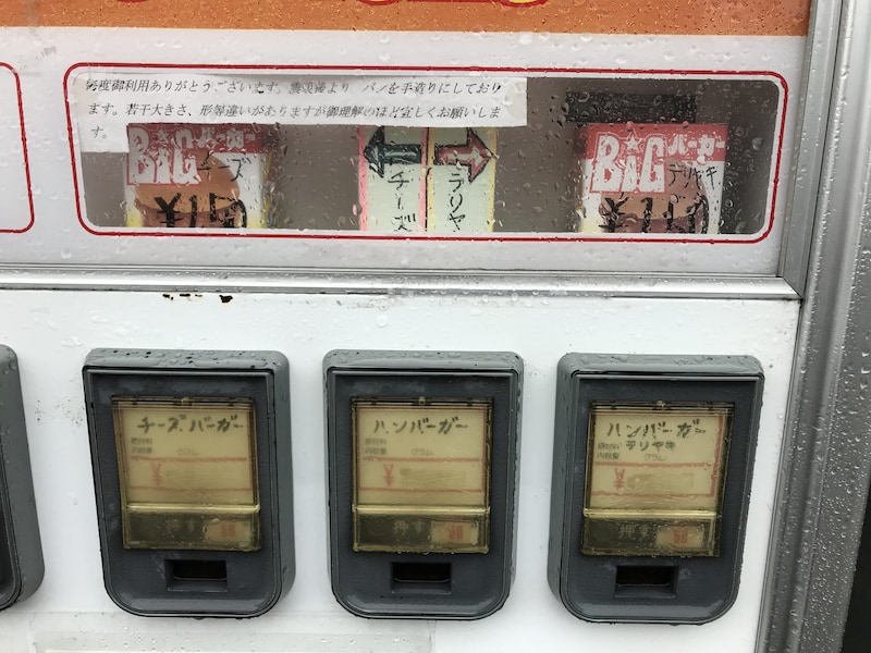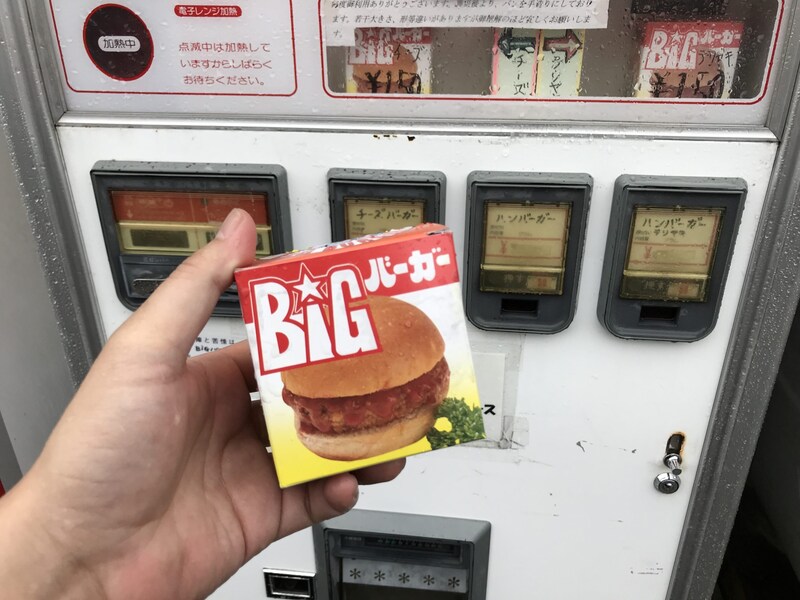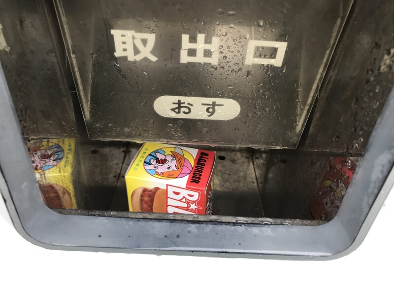 オススメはハンバーガー自販機のハンバーガー。超アツアツ状態で出てくるハンバーガーは、箱の質感、箱を開封したときの薫り、そしてハンバーガーの味、すべてがエモーショナルで素敵です。