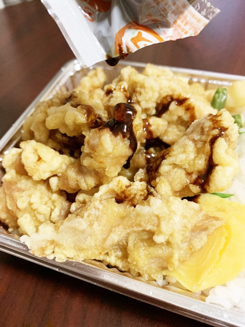 もし唐揚げ弁当を買ったなら、ソースをたっぷりと唐揚げにかけてから食べてください。たいあん弁当の唐揚げ弁当は、ソースをかけてこそ完成形のおいしさになるのです。必ずソースをかけてください。