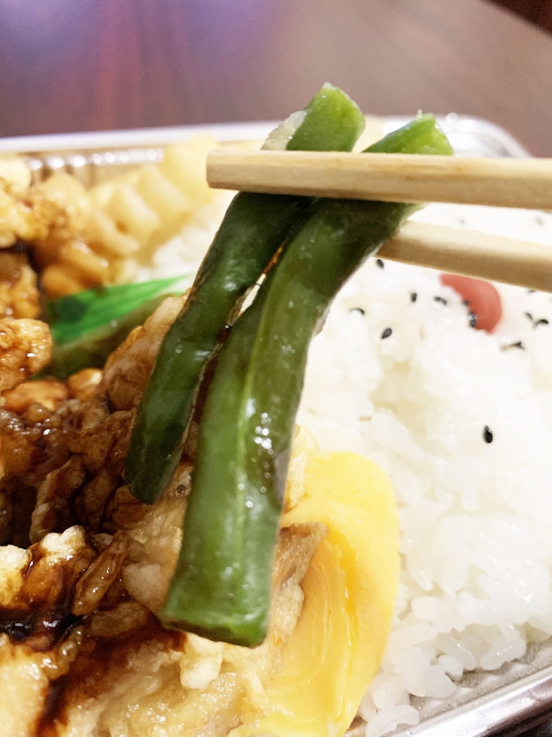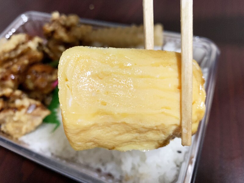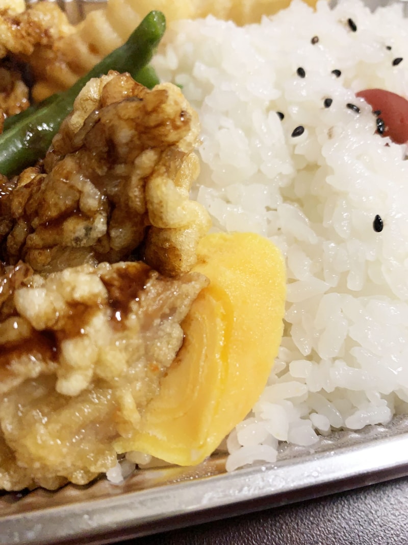 さらに、唐揚げ弁当には深い魅力があります。ソースをまんべんなくかけた唐揚げを食べつつ、ご飯を食べる。その時点で至高なのではありますが、ここで、甘く仕上げられた玉子焼きを食べるのです。ピュアなテイストのインゲンをかじるのです。唐揚げのおいしさを何倍にも増幅させてくれます。