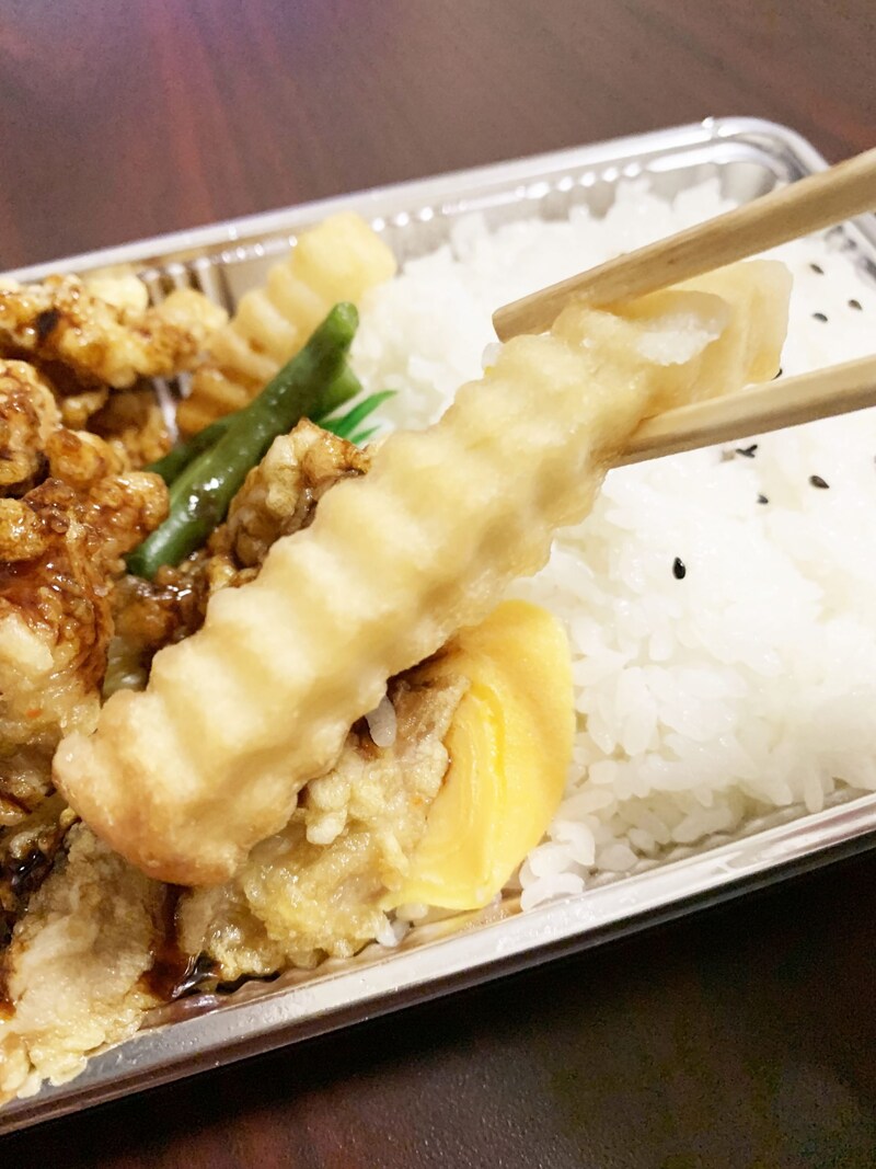 そして、ご飯と唐揚げの熱気で柔らかくなったフライドポテトをかじるのです。これがもう最高オブ最高。唐揚げとご飯、そこにフライドポテト、凄まじい食材三重奏が奏でられます。