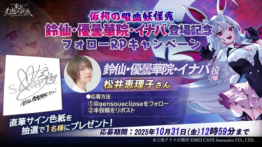 期間中に『東方幻想エクリプス』の公式アカウント(@gensoueclipse)をフォローして対象投稿をリポストすると抽選で1名様に該当キャラクターを演じた声優・松井恵理子さんのサイン色紙をプレゼント! ぜひご参加ください!