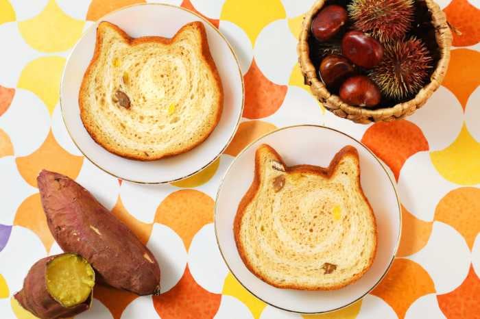 紅あずまを練り込んだミルク100%仕込みの生地と、マロン風味の生地を重ねて焼き上げた『ねこねこ食パン 栗とサツマイモ』。