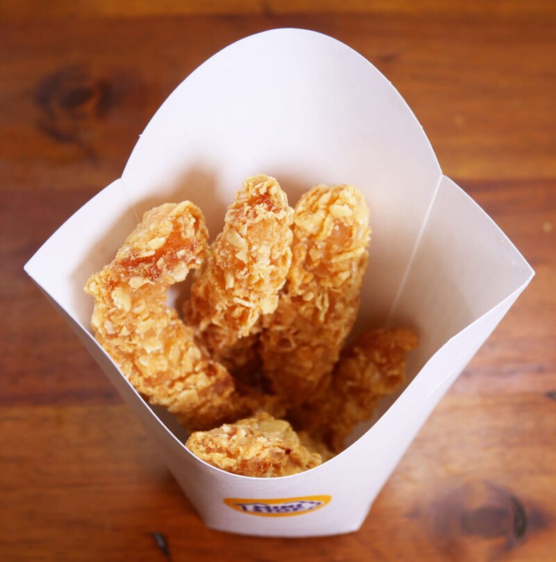 食べてみると、衣のゴツゴツとした、ザクザクとした食感が楽しめる。しかも、けっこう長く楽しめる。けっこう長いザクザク感を楽しんだあとは、散衣に包まれたフワフワのチキンが楽しめる。主役が衣だから、どちらかというと、チキンは衣の引き立て役。だが、それでいい。そういうものだから。