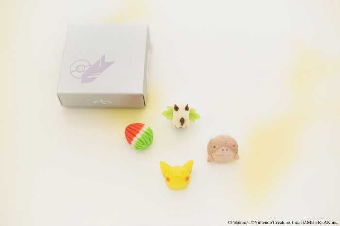 上生菓子(4個入り・2,916円税込)は、ピカチュウ・ホウオウ・ダーテング・ドオーをモチーフに。京都東山の水と上質な素材を使い、職人がひとつひとつ丁寧に手作りしています。