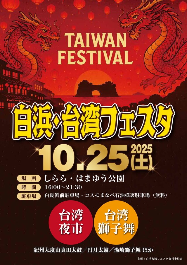 台湾グルメが大充実する夜市や台湾獅子舞など、台湾の魅力を存分に楽しめるイベントが開催されます。ほかにも、紀州九度山真田太鼓や円月太鼓、湯崎獅子舞など、和歌山ならではの伝統芸能が会場を盛り上げてくれます。