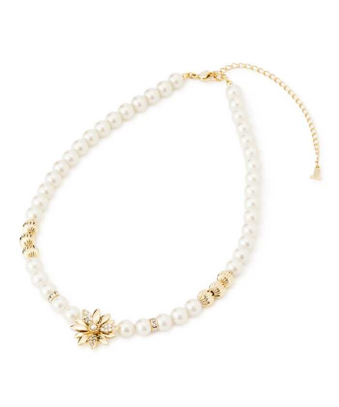 ショートネックレス(24,200円)には、トップにマーガレットモチーフのゴールドパーツをあしらい、控えめながらも存在感のあるデザインに。