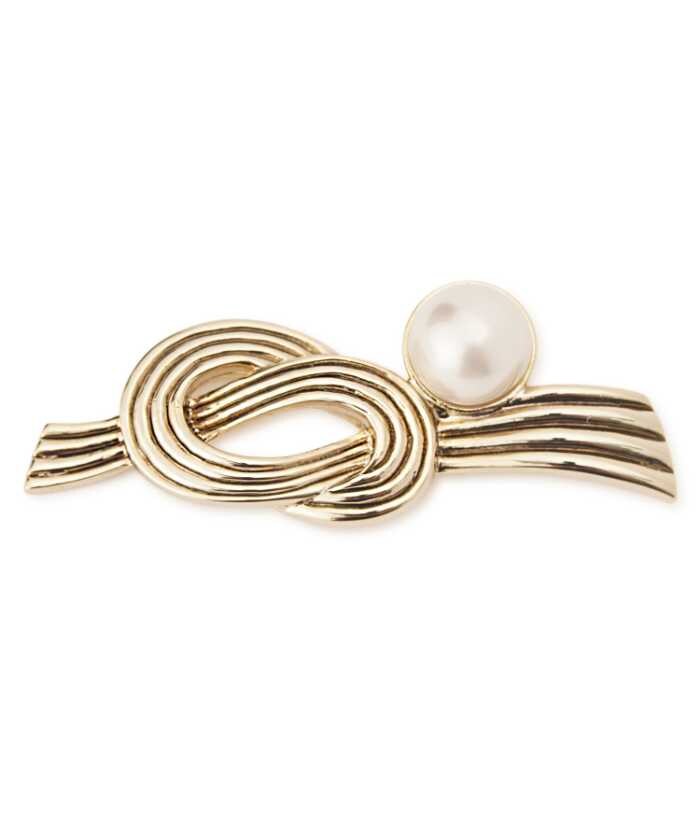 帯を結んだようなフォルムが印象的なブローチ(16,500円)は、“縁を結ぶ”“心を結ぶ”という意味を込めた幸運のモチーフ。ヴィンテージ感とモダンさを併せ持ち、お祝いの席にもぴったりです。
