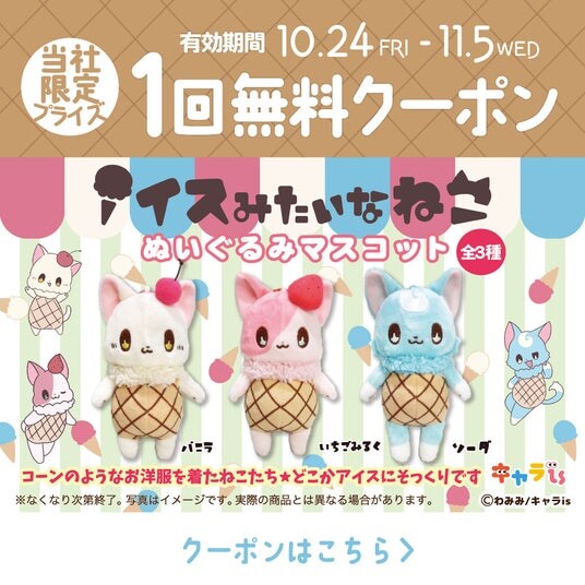 ※「アイスみたいなねこ」が対象のクレーンゲームが1回無料になります。