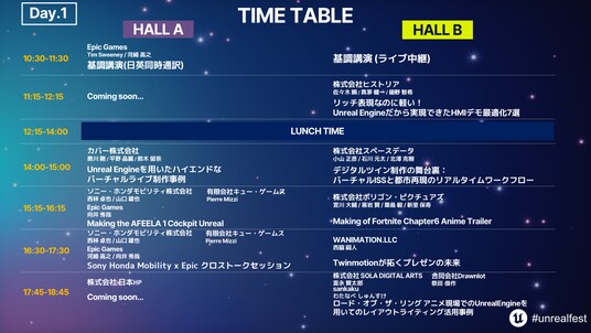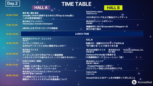 エピック ゲームズ ジャパン(本社:アメリカ合衆国、CEO:Tim Sweeney)は、2025年11月14日(金)・15日(土)の2日間、TAKANAWA GATEWAY Convention Centerにて「Unreal Fest Tokyo 2025」を開催します。Unreal Fest Tokyo では、さまざまな業界の開発者が集い、Unreal Engineの最新機能や活用事例を共有します。このたび、 全セッションのラインナップおよび2日間のタイムテーブルが公開されました。