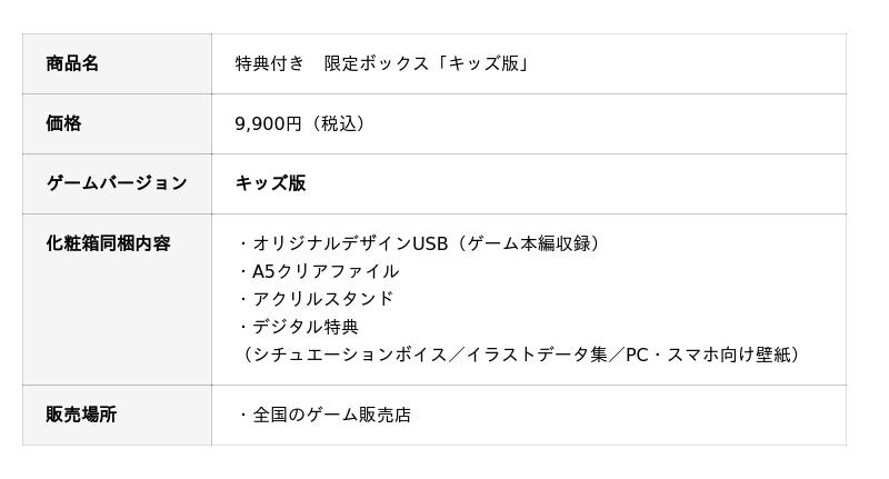 限定ボックス「キッズ版」は、ゲーム本編のセンシティブなシーンを隠し、より広い年齢層に楽しんでいただける内容に調整したものです。