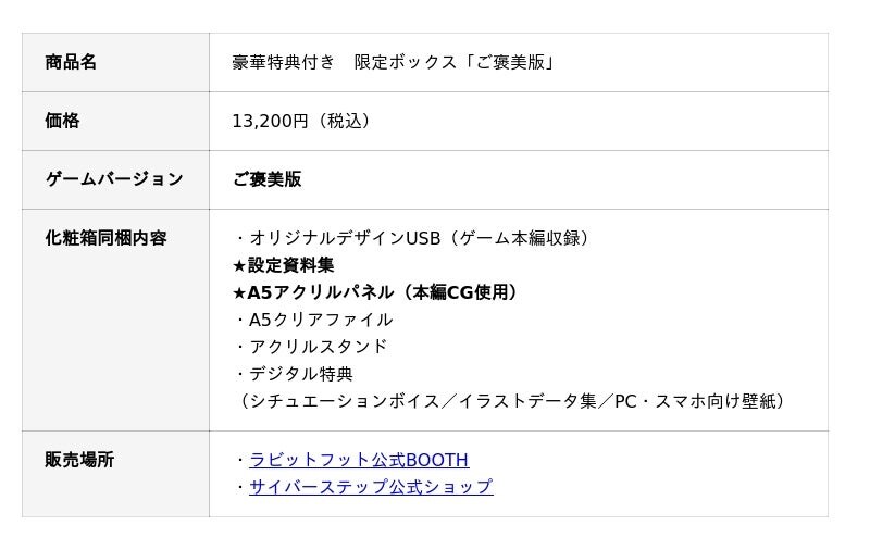 「キッズ版」とは違い、ゲーム本編が「ご褒美版」となっているだけでなく、「設定資料集」と「A5アクリルパネル」の2つのオリジナルグッズが追加された豪華版となります。