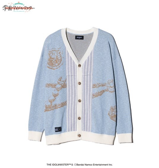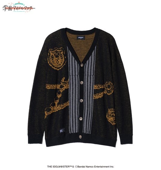 花海咲季の第二弾ソロ楽曲『Boom Boom Pow』の衣装をモチーフにVネックカーディガンを編み上げたBoom Boom Pow Cardigan。ボディをラグジュアリーに彩るのは、本人が着用するキャップに見られるエンブレムと要所に配されたジュエリーパーツのデザイン。全面にジャカード編みで表現することでストリートファッションへの解釈を込めています。前合わせにあたる部分はストライプ生地で切り替え。1枚で花海咲季の着こなしを再現したギミックとなっております。ボディは着丈と身幅にゆとりを持たせたルーズフィット。リラックスとエレガンスが同居した佇まいを演出します。