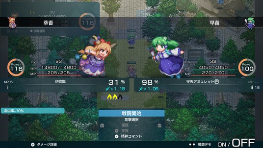 武器ごとに違った多彩なバトルアニメーションによって展開される敵との戦闘。斬る、撃つ、殴るのアクションから「東方Project」らしい「スペルカード」を使った必殺技まで美しい幻想郷で躍動するキャラクターたちの活躍をお楽しみください。
